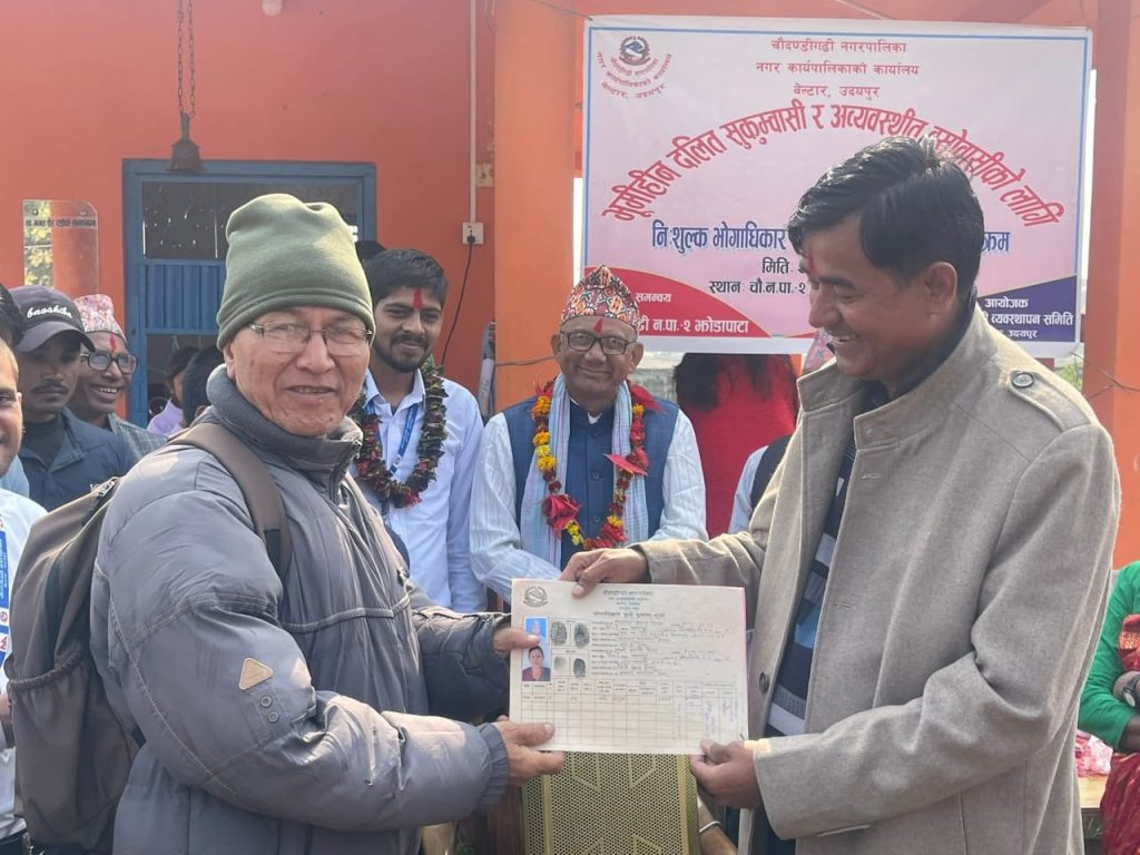 यसै क्रममा बुधबार चौदण्डीगढी नगरपालिका वडा नं. २ का १२३ जना भूमिहीन दलित तथा भूमिहीन सुकुम्बासीलाई भोगाधिकार दर्ता प्रमाण–पुर्जा वितरण गरिएको छ।